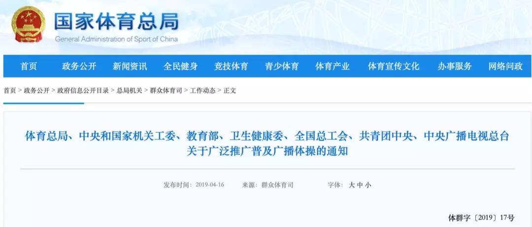 其实,早在今年4月16日,国家体育局就发布了《体育总局、中央和国家机关工委、教育部、卫生健康委、全国总工会、共青团中央、中央广播电视总台关于广泛推广普及广播体操的通知》(以下简称“通知”),通知要求中央和国家机关各单位机关工会,各省、自治区、直辖市、计划单列市、新疆生产建设兵团体育局、教育厅(教委、教育局)、卫生厅(局)、总工会、共青团、有关部门充分认识推广普及广播体操的重要意义、采取切实措施保障推广普及广播体操工作落到实处。