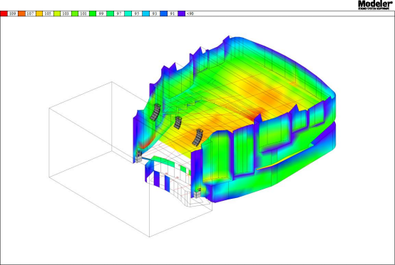 因此,Bose Professional通过Bose的声场模拟分析软件Modeler,对扬声器的安装位置及角度进行多次声场模拟分析,最终采用非对称水平角度的弧形曲率阵列扬声器来实现最佳的音色平衡,减少侧墙反射(从图2可以看出,打在侧墙的声能量几乎没有),对不同位置的听音区提供均匀的声覆盖(从图3可以看出,整个观众区的声场覆盖非常均匀)。